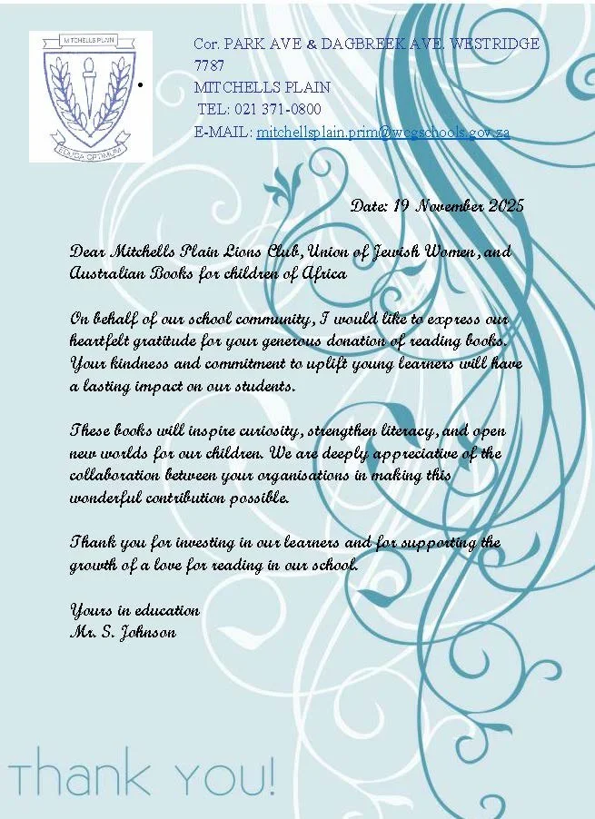 Thanks to the Union of Jewish Women in Cape Town for distributing ABCA books