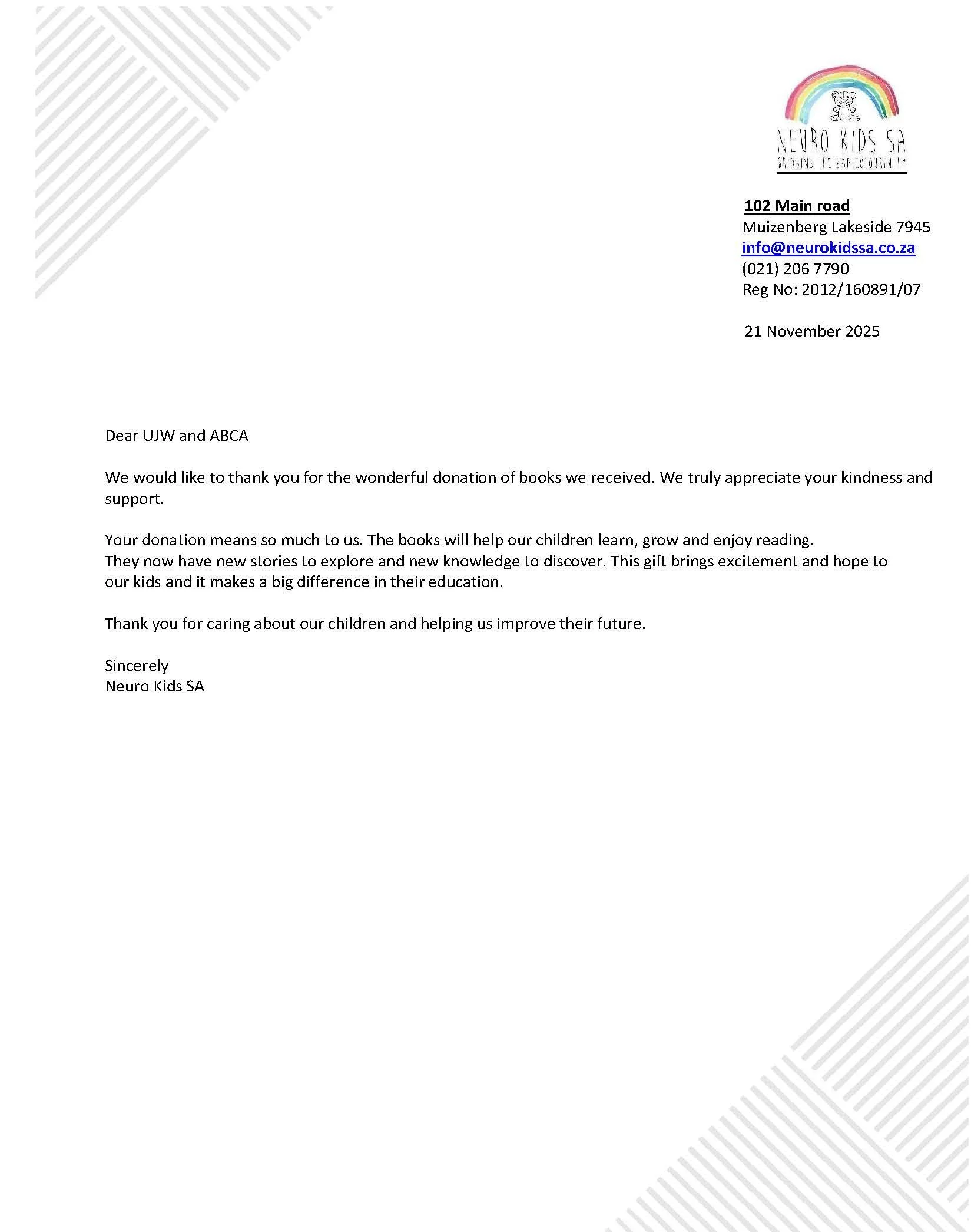 Thanks to the Union of Jewish Women in Cape Town for distributing ABCA books Cape Town 15 Mar Written By Yael Garkawe Yael Garkawe