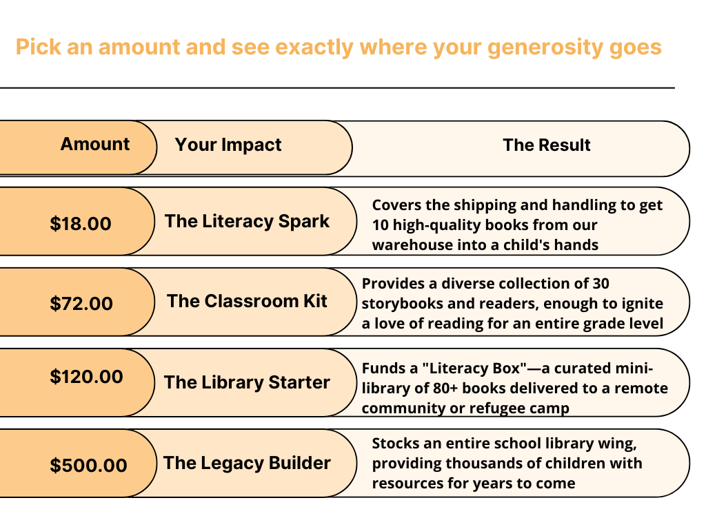 All funds raised are used directly to pay for the shipping and distribution of books and customs clearance in destination countries.