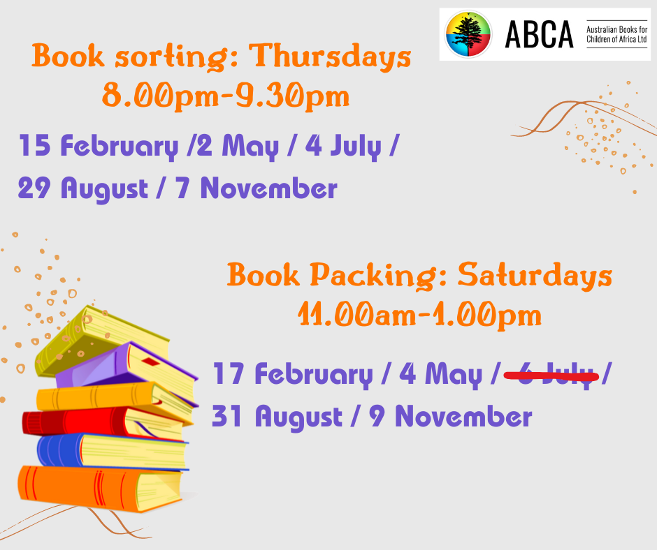 Join us in the ABCA shed for book sorting on Thursday evenings from 8.00pm and for book packing on Saturdays, 11.00am - 1.00pm